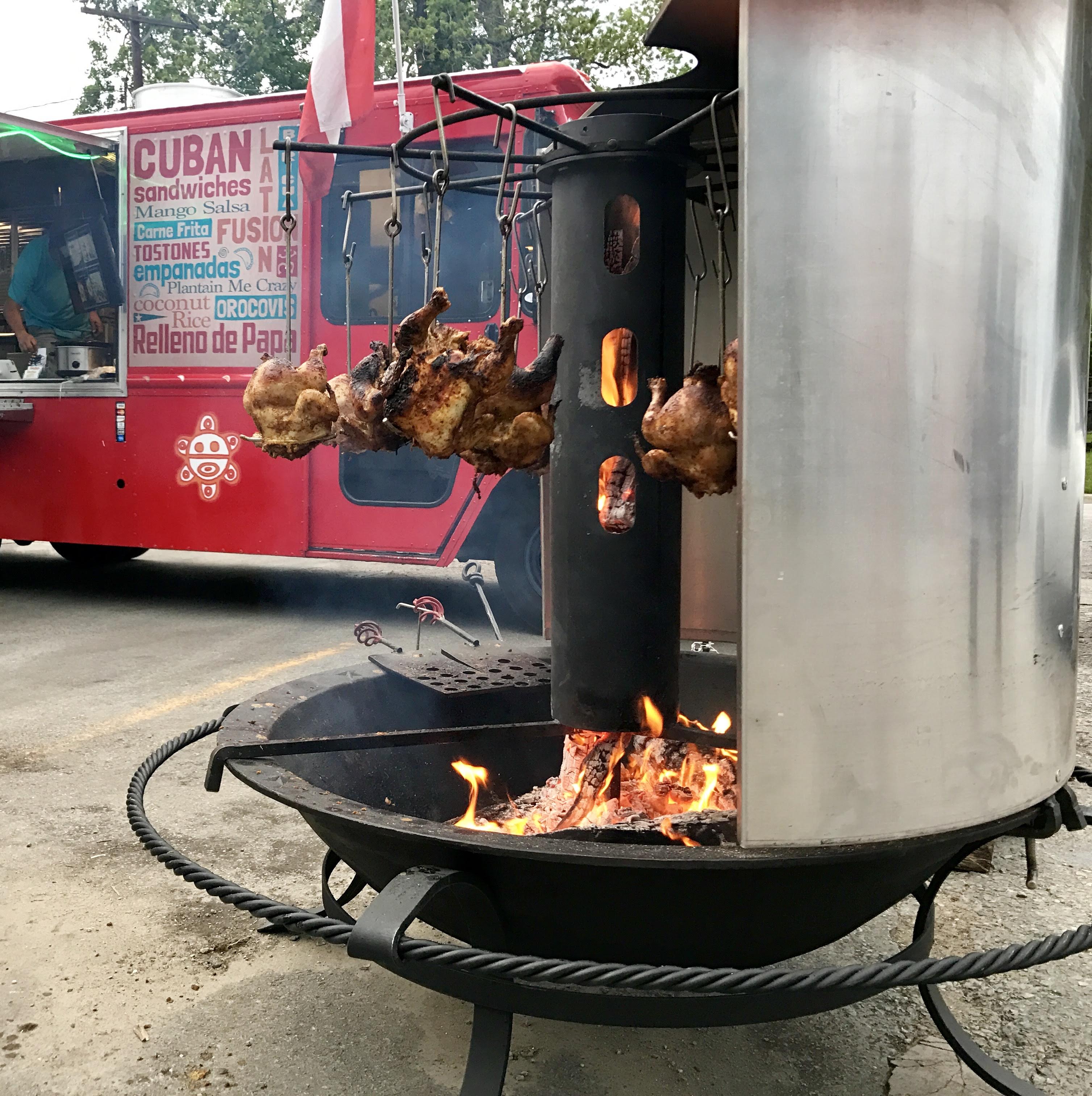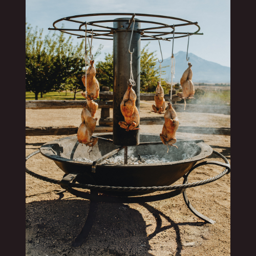 360° rotating carousel rotisserie ensures even cooking over open flame.